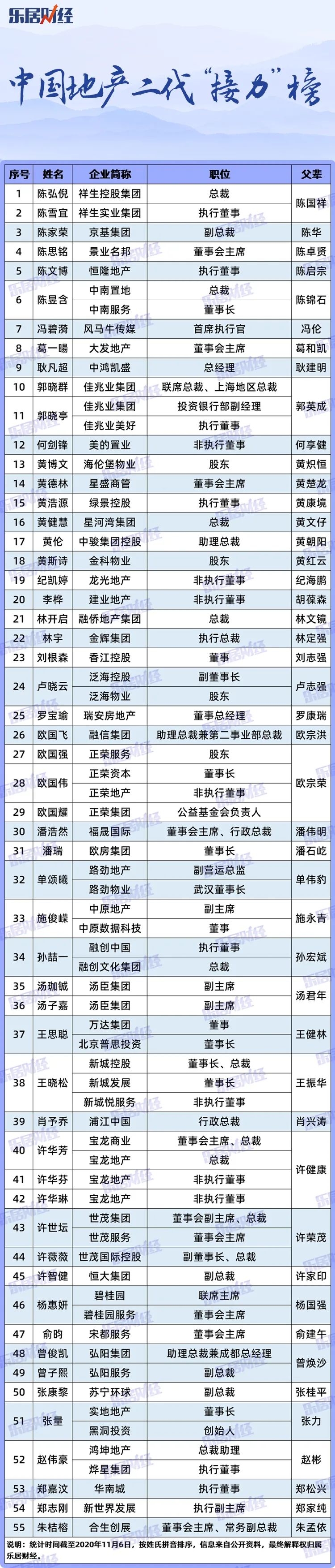 据统计,在地产和物业两大板块中,已有55位二代出现在了公司高管名单中,逐渐走向大众视野。其中,有22位已出任董事长或总裁,成为企业掌权者。