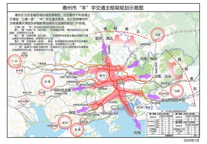 2019年11月,惠州市交通运输局首次公布“丰”字交通主框架总体布局规划草案,提出建设总里程约485公里,由“三横一竖”四条轴线构成的“丰”字型城市交通网络,实现惠州城市发展区各组团之间30分钟互通,中心城区30分钟可达,形成1小时内通达广深港特大城市的快速通道,实现惠州城市中心区、空港经济区40~50分钟对接莲塘口岸。