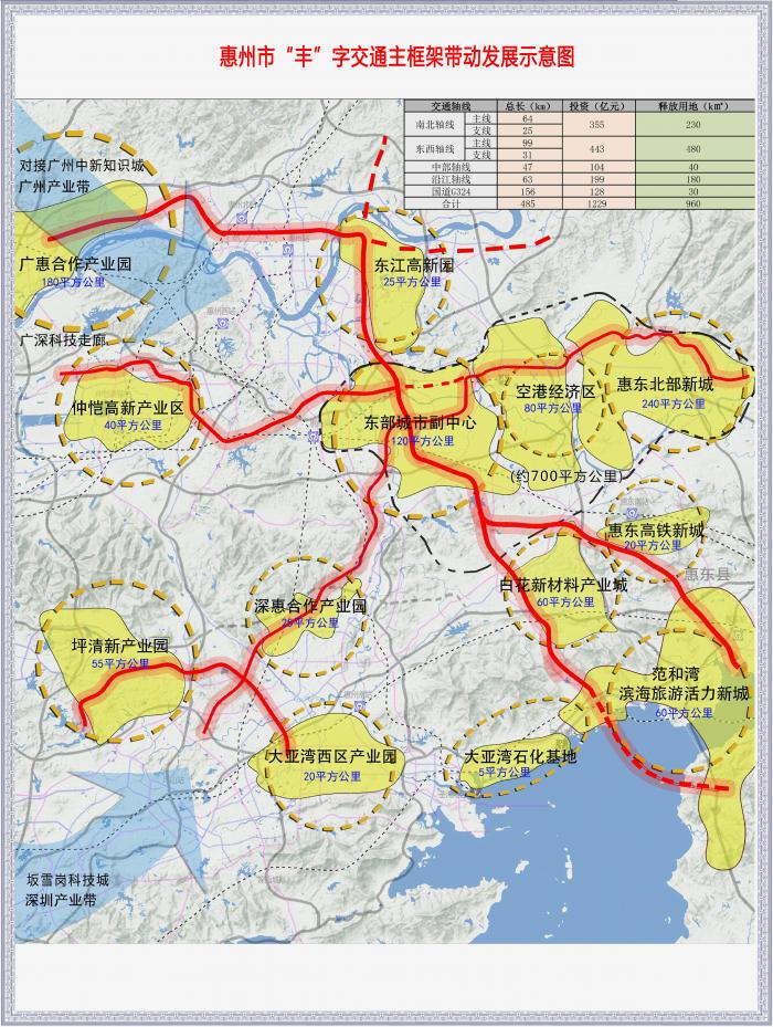 值得注意的是,施为学指出“丰”字交通网络建设将激发惠州用地潜力,释放产业发展空间,“通过‘丰’字交通规划把惠州城市骨架拉开后,我们可以带动的潜在开发用地规模达960平方公里,每个县区都可围绕‘丰’字交通路网集中打造产业片区,真正做到交通带动产业,产业支撑城市。”