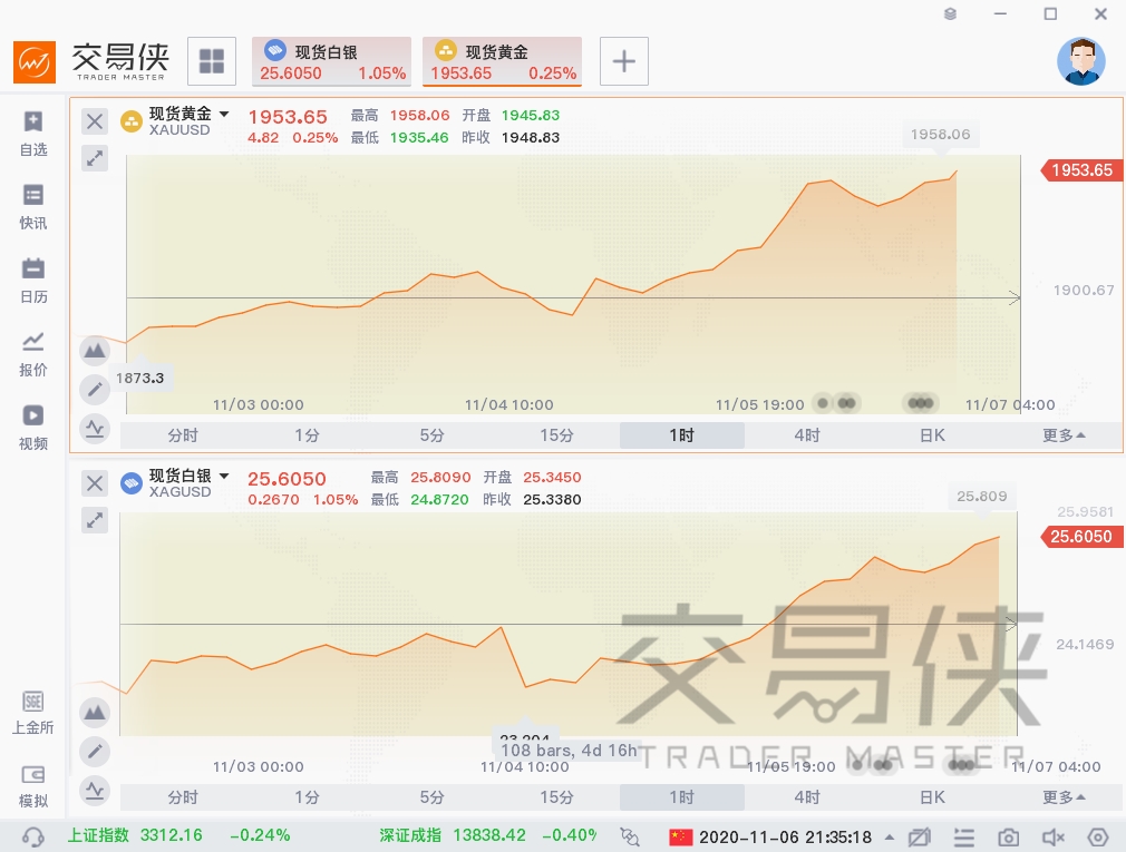 现货黄金本周整体呈上涨趋势,欧美等地的疫情爆发,再加上美国大选的影响,本周现货黄金从1870附近一路上扬,周三小幅回调后,黄金周四再度发力,从1900美元涨至1952美元,涨逾50美元。周五黄金继续上涨,截至发文,交投于1958美元附近。黄金本周或有望取得7月以来的最大单周涨幅。