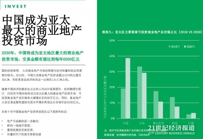 随着中国经济的服务业占比和人均GDP逐渐提升,世邦魏理仕预计,2030年中国内地将成为亚太区最大的商业地产投资市场:可投资商业地产总价值将大幅增长至约80万亿元;同时,商业地产大宗交易金额有望较当前水平增长两倍左右至每年近6500亿元。