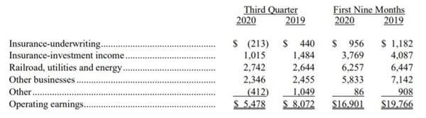 伯克希尔在财报中表示,随着3月下旬开始的COVID-19大流行加速,公司大部分业务都受到了负面影响,迄今为止的影响从相对轻微到严重不等。由于零售店、餐厅和娱乐场所等人流聚集的设施关闭,公司大多数制造业、服务业和零售业的收入和收入在第二季度大幅下降,在某些情况下严重下降,公共旅行限制和某些公司的关闭。在2020年第三季度,与第二季度相比,其中几家公司的收入和收益大幅增长。