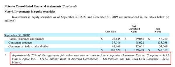 截至2020年9月30日,伯克希尔大约70%股票持仓集中在四只股票,分别是: