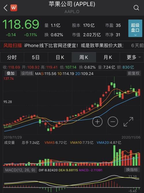 今年以来,苹果股价从73.41美元一路飙升至当前的118.69美元,累计大涨62%,最新市值高达2.02万亿美元。