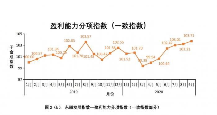 报告中显示,2020年9月份的盈利能力一致指数由8月的103.21小幅上升到103.71,已超过了2019年8月的最高值103.57。