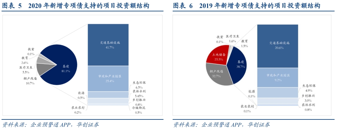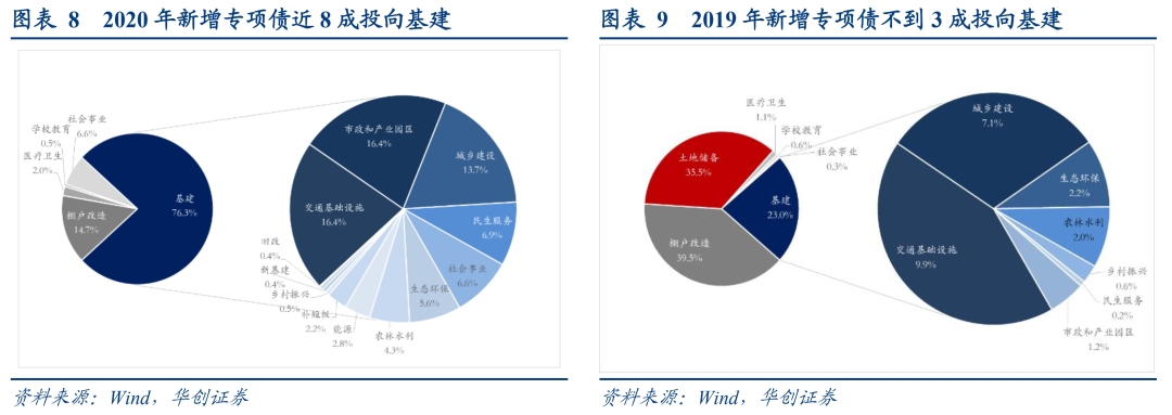 今年已新增发行的3.6万亿专项债中,有2.5万亿标明了明确投向,其中投向基建领域占比近8成,较去年(占比23%)提升明显,突出稳投资、保民生两大重点。基建领域中,投向党中央、国务院确定的交通基础设施、能源、农林水利、生态环保、民生服务、冷链物流、市政和产业园区基础设施等七大领域的占56%,具体到单个基建领域看,最多投向交通基础设施、市政和产业园区(占比16.4%),投向新增领域相对较少,新基建、旧改专项债合计占比约1%;非基建领域中,全年无土储专项债发行,用于棚改仅占14.7%(去年两项合计占比逾7成)。