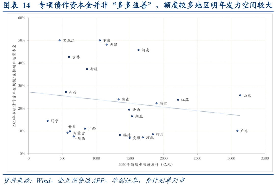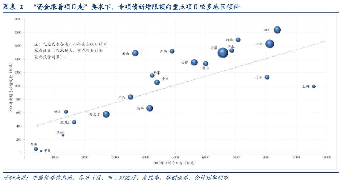 “资金跟着项目走”使今年额度向重点项目较多地区倾斜、明年料将延续,需跟踪年末各地重点项目申报。今年4月初,财政部副部长许宏才谈及额度下达时表示,“按照‘资金跟着项目走’原则,对重点项目多、风险水平低、有效投资拉动作用大的地区给予倾斜”。以各地2020年重点项目计划完成投资额衡量重点项目多寡,云南、安徽、四川等计划投资额较大地区(气泡较大)多位于趋势线上方,显示新增限额分配向重点项目更多地区倾斜。