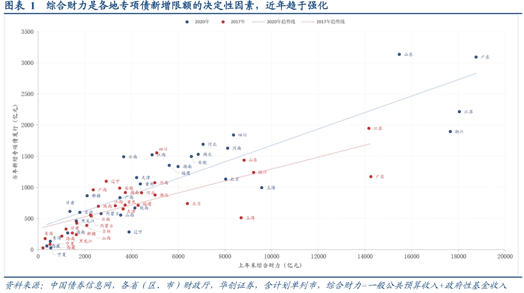 专项债额度分配“能者多得”,各地综合财力(一、二本账收入之和)是新增限额的决定性因素,今年各地新增专项债发行排名与去年末综合财力排名基本一致,今年末综合财力仍可作为明年额度分配的有效参考。目前地方政府债务实行限额管理,新增限额按公式计算[1],体现正向激励原则:财政实力强、举债空间大、债务风险低、债务管理绩效好的地区多安排,财政实力弱、举债空间小、债务风险高、债务管理绩效差的地区少安排或不安排。今年新增专项债发行前三位的山东、广东、江苏2019年末综合财力列前四位,新增专项债发行末三位的青海、西藏、宁夏2019年末综合财力也列末三位。对比新增限额公式确立的2017年,以综合财力为横坐标、新增专项债发行为纵坐标的各地散点与整体趋势线更为贴合,显示综合财力对地方新增限额的决定性作用趋强。