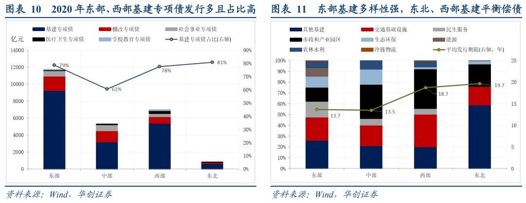 分区域看,东部、西部基建专项债发行多且占比高,是稳投资的主要动力来源;中部基建专项债发行、占比均较低、东北基建专项债发行占比最高但发行量有限,对基建拉动相对乏力。基建专项债中,东部整体结构最为均衡、其中民生服务、能源项目占比较高,显示其项目多样性较强、储备相对充分;中部、西部市政和产业园区专项债占比较高,显示其对土地相关收入依赖较强。西部、东北交通基础设施、其他基建(主要为城乡建设)专项债占比较高,导致项目平均发行期限偏长,显示其稳投资同时仍需平衡偿债压力。