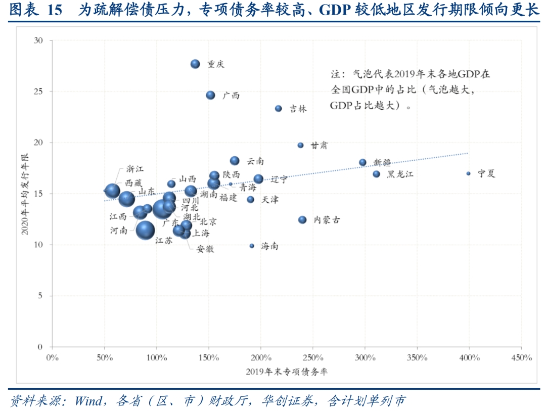 从发行角度看,今年专项债平均发行期限明显拉长至15年(去年为9年),或有疏解债务风险的考量。我们发现,去年末专项债务率(专项债余额/政府性基金收入)越高、GDP越低(气泡较小)的地区,今年新增专项债的发行期限倾向于越长,反映地方发行专项债稳投资的同时,仍留意疏解偿债压力。对于年末专项债务率仍较高地区,预计明年专项债发行期限将进一步延长。