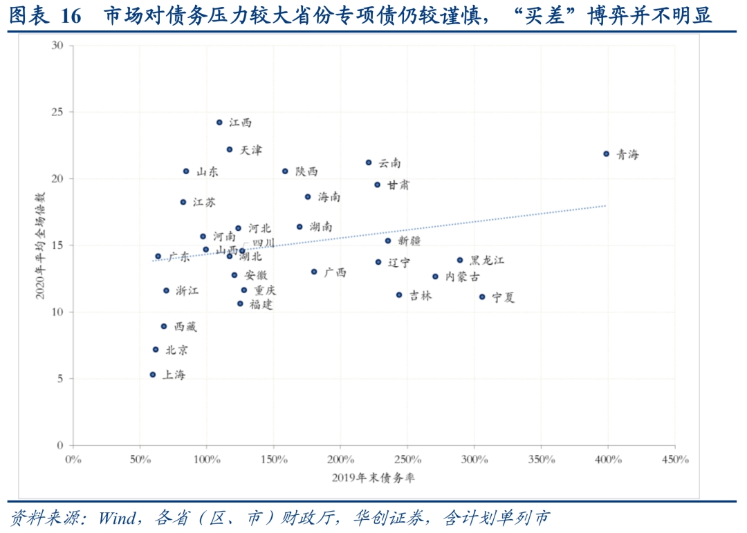 从需求角度看,针对地方债务压力的“买差”博弈并不明显。以债务率((一般债余额+专项债余额)/(一般公共预算收入+政府性基金收入))衡量地方债务压力,我们发现,各地平均全场倍数和债务率的关系并不明显,显示市场对债务压力较大省份的专项债仍较谨慎,并未出现明显的“买差”博弈倾向。