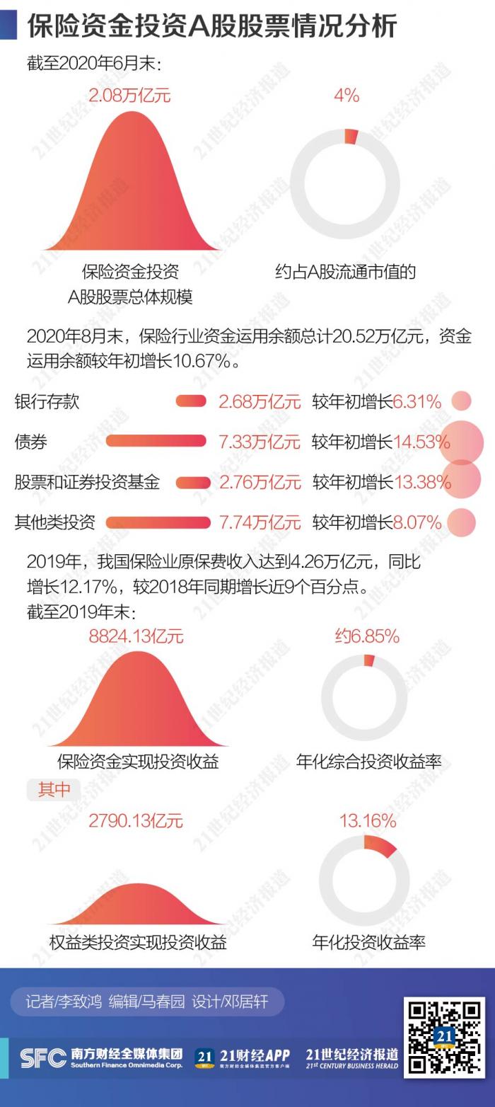 今年以来,保险资金权益类投资活跃。截至2020年6月末,保险资金投资A股股票总体规模2.08万亿元,约占A股流通市值的4%,是股票市场最大的机构投资者之一。