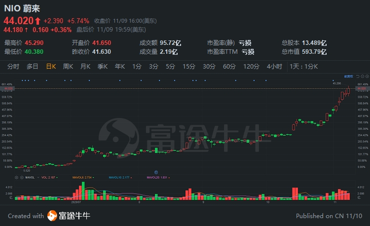 经过数个月的暴涨后,新能源车走势开始分化,特斯拉维持横盘震荡走势,小鹏汽车和理想汽车上冲乏力,比亚迪股份高位回调,只有蔚来仍在创新高,昨日(11月9日)盘中触及45.29美元的历史高点,收涨5.74%.
