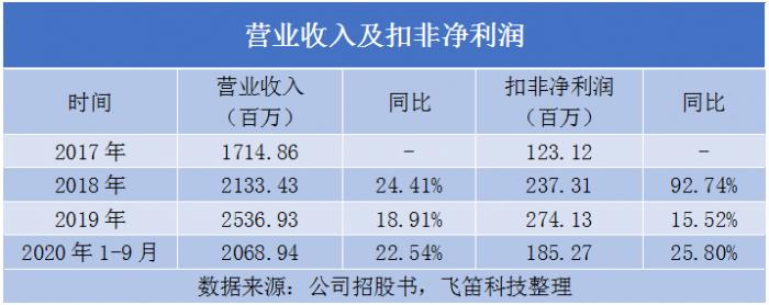 据招股书最新数据,2020年1-9月,公司实现营收20.69亿元,同比增长22.54%,同期扣非净利润为1.85亿元,同比增长25.8%。公司的主营业务收入具有一定的季节性波动特征,其中四季度的收入年内最高。