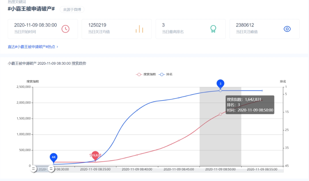 11月9日,“小霸王被申请破产”这一话题于8:30登上微博热搜,短短20分钟内便以160万的搜索指数攀升至热搜榜第三名。