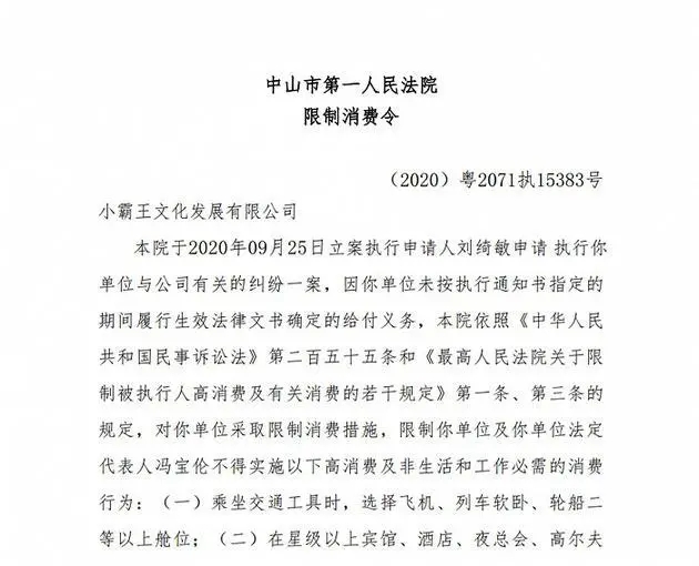 根据全国企业破产重整案件信息网公示信息,小霸王文化发展有限公司已于11月5日被申请破产重整,申请人为殷小云,公司执行董事冯宝伦被限制高消费。