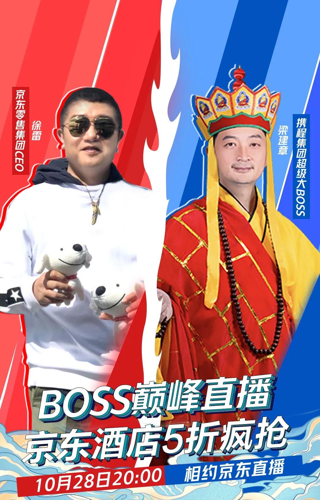 10月28号晚8点,在每周三“梁建章BOSS直播间”里,京东零售CEO徐雷首次现身,和携程董事局主席梁建章以“西游巅峰会友”为主题共同进行旅游产品直播带货,直播间中以全国多个省市的高端酒店产品为主,价格低至五折,引发消费者抢购热潮。根据携程发布的战报显示,10.28“携程巅峰热播日”累计创造的交易额超3.8亿元,观众人数达1974.1万。