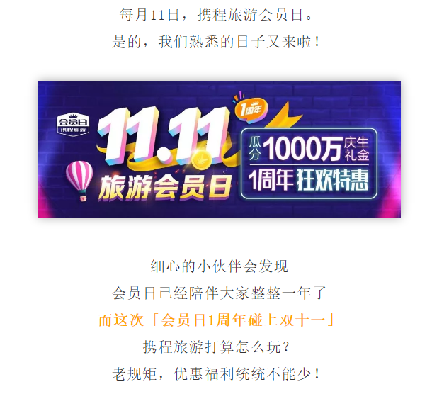 携程方面对今年双11的旅游大促同样表示乐观,“携程旅游在今年会创一个峰值,国内游预计会明显超过去年。今年旅游业整体上是持续复苏的趋势,十一假期已经说明,国人对于旅游的出行需求非常可观,但仍然没有完全释放出来。出境游仍不明朗的情况下,春节就是下一个全民放松的旅游高峰。所以双11在高流量和高补贴的情况下,必然能够进一步激发提前预购春节出行需求。同时,在年底不少上班族也会有休年假、淡季省钱旅游的需求。建议所有供应商都要抓好这次机会,刺激淡季业绩、提前抓住明年春节需求。”