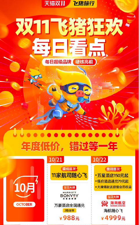 飞猪方面此前宣布,今年天猫双11期间,万豪国际、海南航空、希尔顿、上海迪士尼、长隆等旅行大牌将轮番登陆飞猪超级品牌日,带来超过400款专为双11量身定制的独家新品。