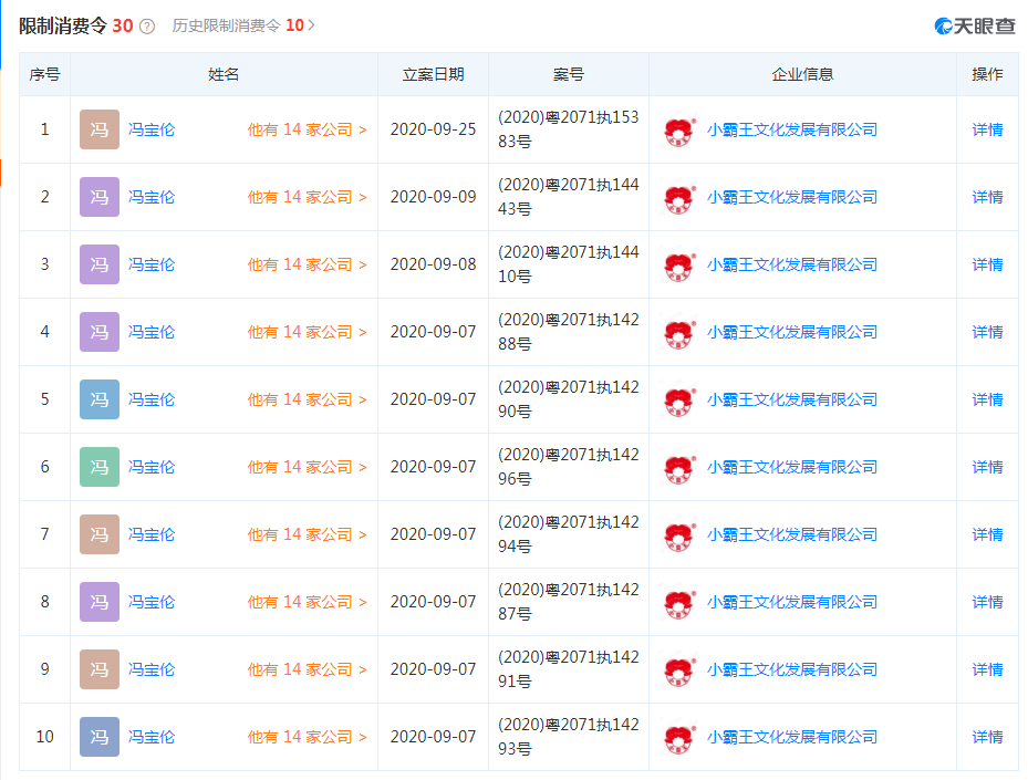 11月8日,天眼查 APP显示,小霸王文化发展有限公司被申请破产重整,同时该公司法定代表人冯宝伦经由中山市第一人民法院裁决,目前已被列为限制高消费人员。