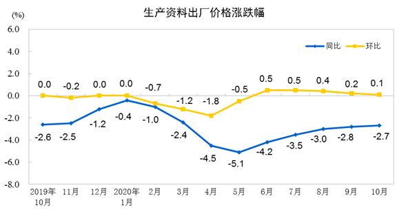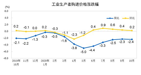 2020年10月份,全国工业生产者出厂价格同比下降2.1%,环比持平;工业生产者购进价格同比下降2.4%,环比上涨0.2%。1―10月平均,工业生产者出厂价格比去年同期下降2.0%,工业生产者购进价格下降2.6%。