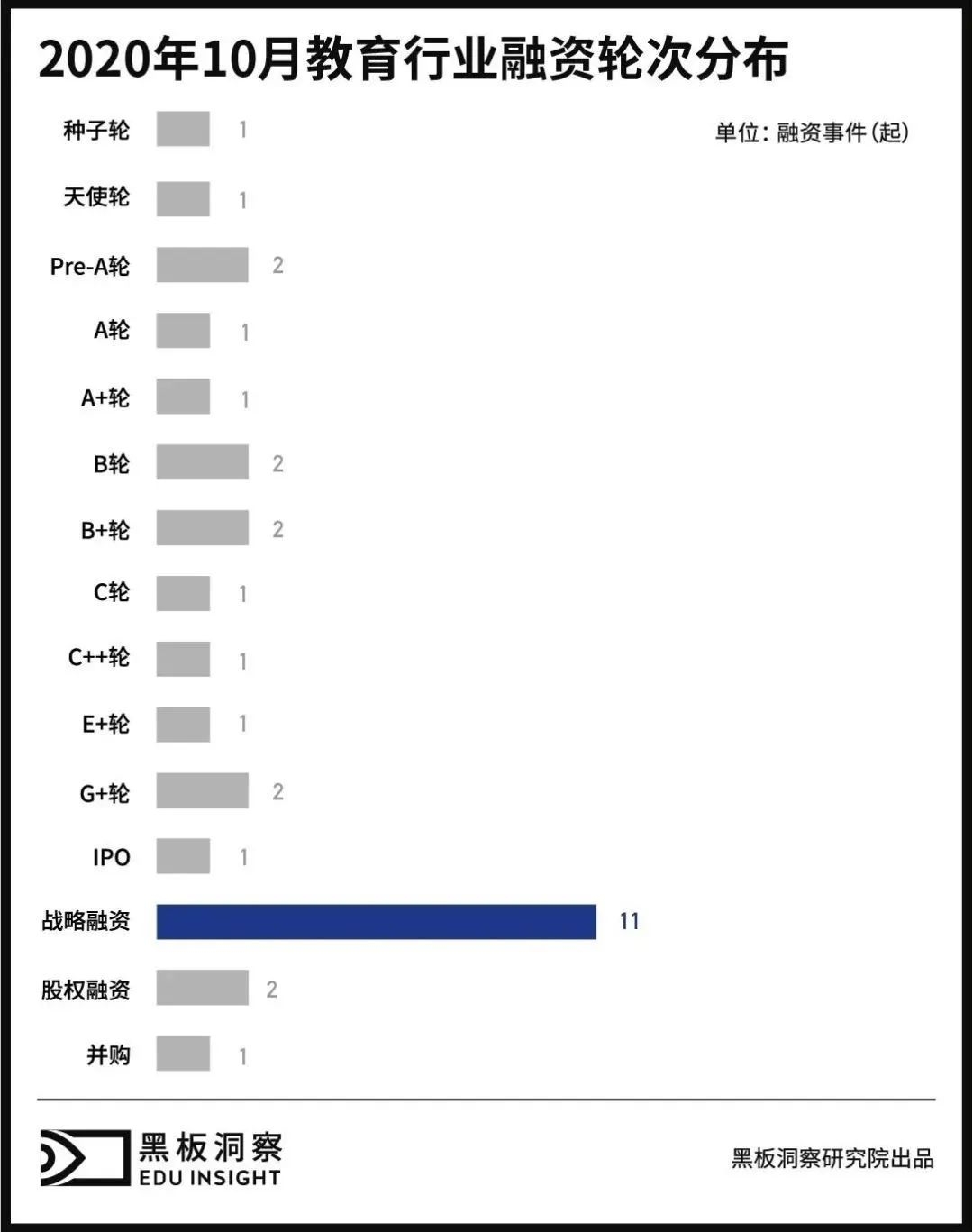 总体来看,2020年10月的融资情况呈“爆发式”增长,无论是事件数量还是金额体量都远超此前的9月。且10月的融资已跃居成为2020年融资最高峰,融资事件数量超过9月的22起,金额体量超过3月的71亿元。此外,融资轮次也呈现“多点开花”的态势,共有15种不同轮次的融资,从早期种子轮、天使轮到中期B轮、C轮,再到后期G+轮、并购甚至是IPO,均有涉及发生。由此可见,经过前两月的持续回暖,10月教育行业迎来了一次大爆发,热度大幅提高,赛道十分活跃。
