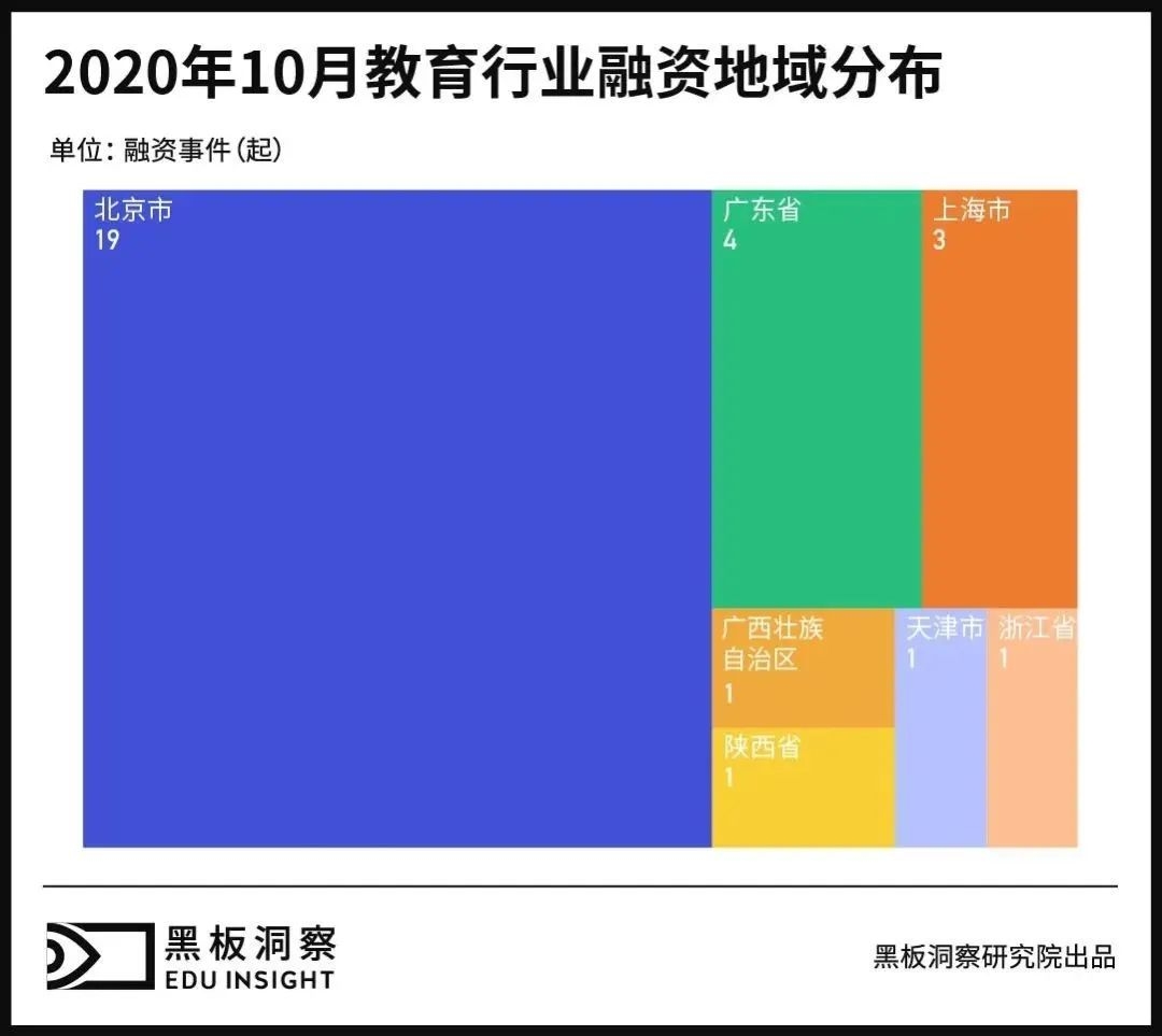 从地域分布来看,10月的融资地域主要还是分布在北京地区,共有19起发生,占比高达63.33%,与9月相比高出了20%。融资地域分布范围较9月有所减少,从9月的9个省市减少到7个省市。其中,广东发生4起,上海发生3起,天津、浙江、广西、陕西各有1起发生。
