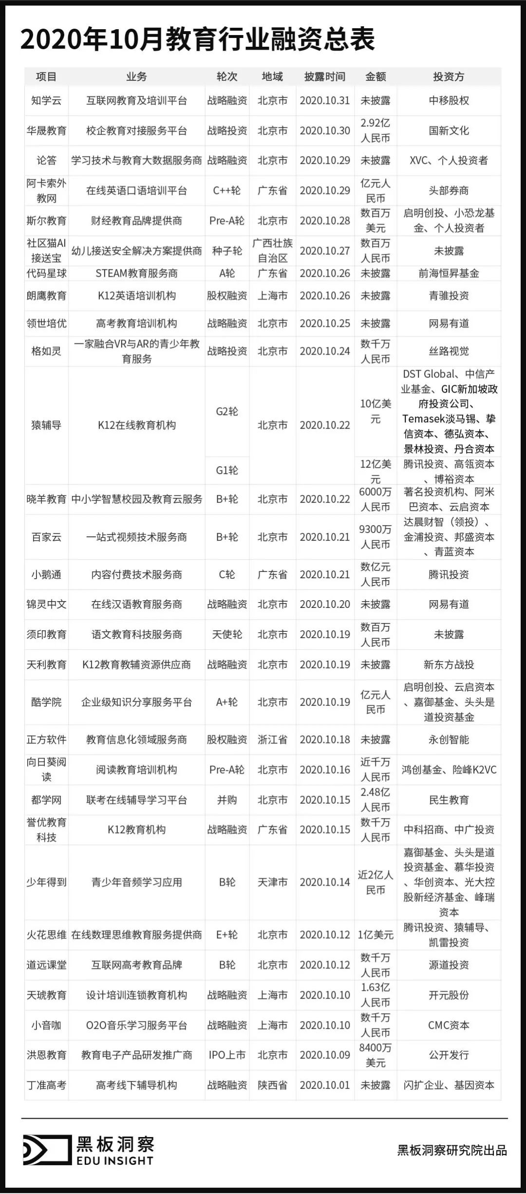 从融资角度看,教育独角兽对整个教育行业的影响显而易见,猿辅导一家企业的融资就占总金额的83.3%,随之带来的则是2020年10月的融资金额是2019年同期的23倍之多(2019年10月共融资7.59亿元)。