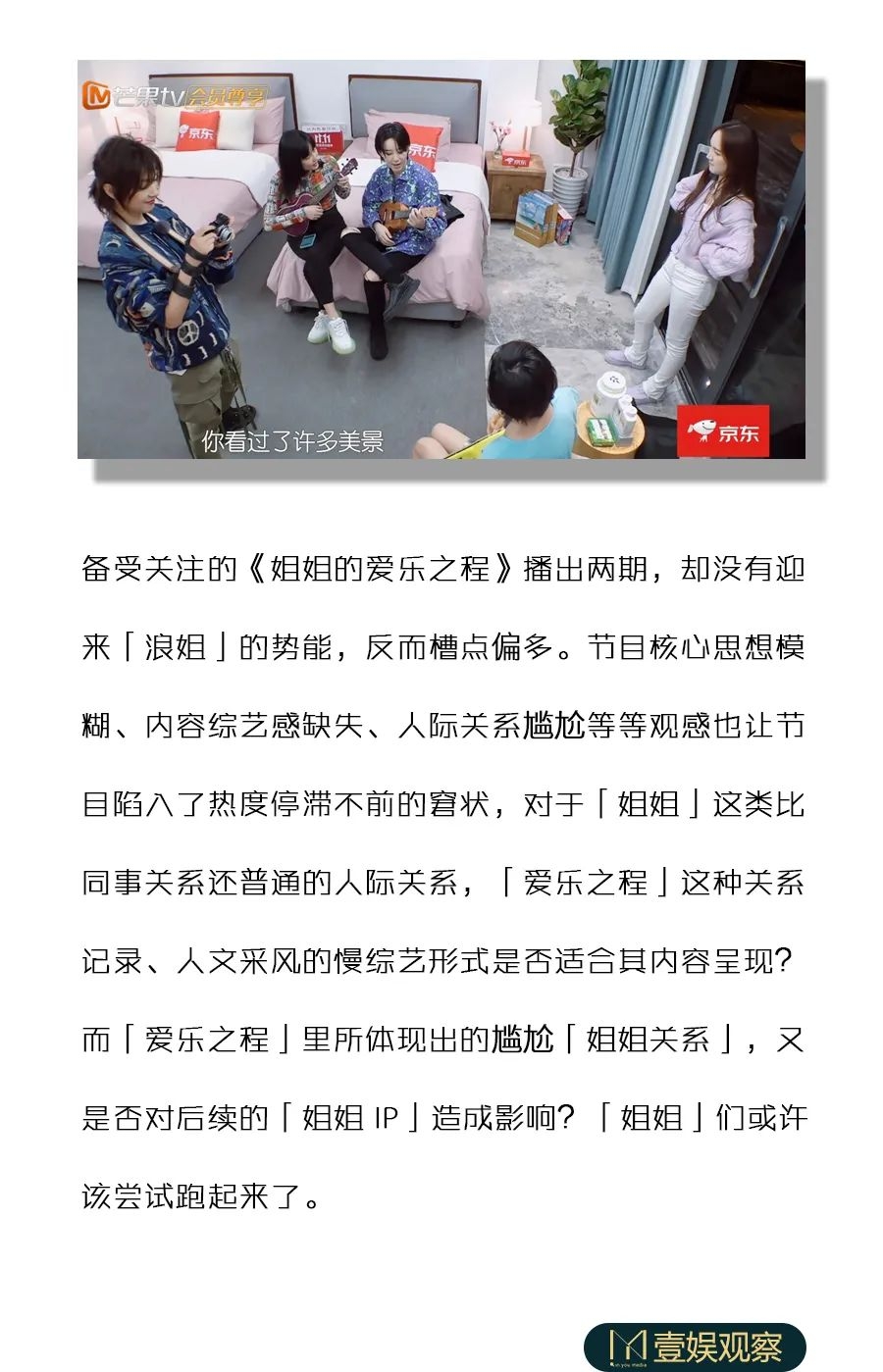 但同时,两集更新下来,《姐姐的爱乐之程》所暴露的节目核心思想模糊、综艺感缺失等问题,不断让节目趋于平淡,而陷入了口碑危机。