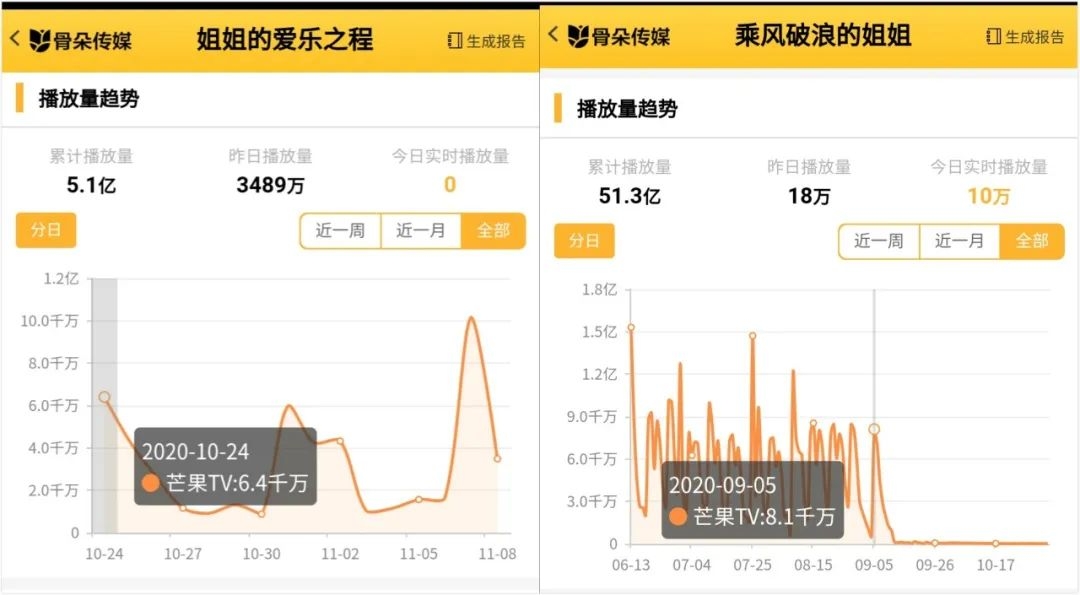 而根据骨朵数据统计,《姐姐的爱乐之程》第二期上线次日(11月7日)芒果TV的播放量为1.0亿,这是截止到目前节目播放量的最高值,而前两次更新次日的播放量仅为6400万和6000万。即使被认为是高开低走的《乘风破浪的姐姐》(以下简称《浪姐》),总决赛次日芒果TV的播放量也有8100万。
