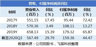 先来看公司的收入情况。据公司招股书最新数据,截至2020年三季度,明新旭腾实现收入5.67亿元,同比增长29.79%,归属于母公司股东净利润为1.59亿元,同比增长44.47%。从往年数据看,2019年,公司实现收入6.58亿元,同比增长15..9%,归属净利润为1.79亿元,同比增长65.87%,营业收入增速和归属净利润增速较2018年均得到提升。