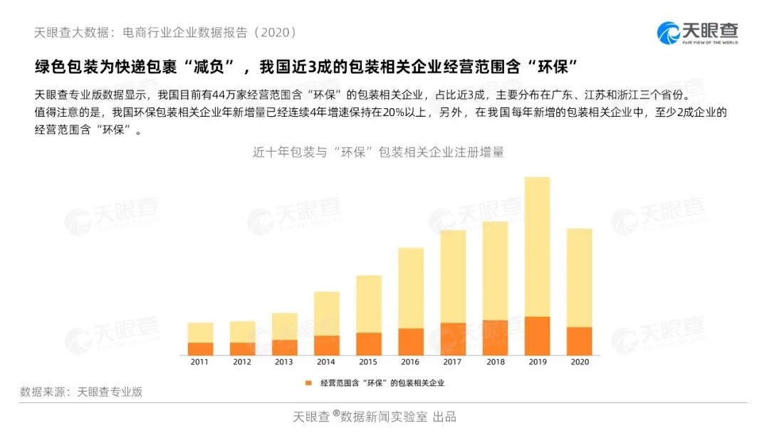 总体来看,天眼查专业版数据显示,我国超378万家电商相关企业,较多集中在沿海地区;今年新增的直播相关企业为2019年全年增量的5倍;快递物流方面,我国近3成的包装相关企业经营范围含“环保”,助力快递包裹“减负”。