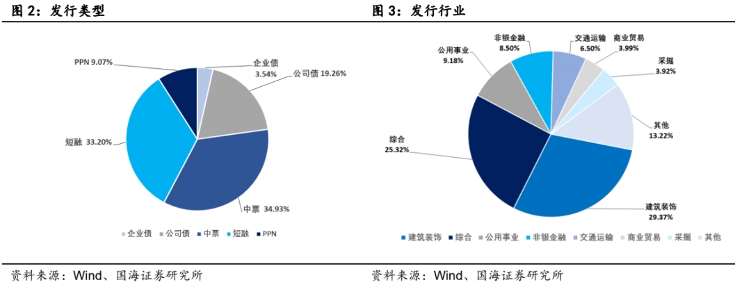 发行行业方面,本期信用债发行行业主要包括建筑装饰、综合、公用事业、非银金融、交通运输、商业贸易、采掘,发行金额占比29.37%、25.32%、9.18%、8.50%、6.50%、3.99%、3.92%。