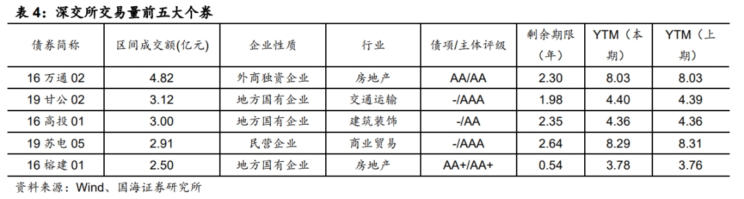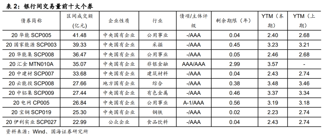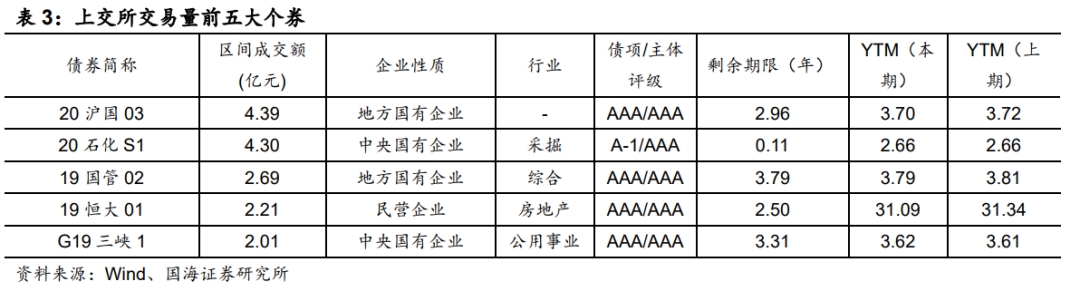 本期银行间成交最活跃的个券是20华能SCP005、20国家能源SCP003、20华能集SCP008、20汇金MTN010A、20中建材SCP007、20云能投SCP008、20中铝集SCP009、20电网CP005、20宝钢SCP019、20伊利实业SCP027,银行间市场是公用事业行业比较热门。上交所最活跃个券是20沪国03、20石化S1、19国管02、19恒大01、G19三峡1,深交所则是16万通02、19甘公02、16高投01、19苏电05、16榕建01,交易所市场是房地产行业受到较多关注。