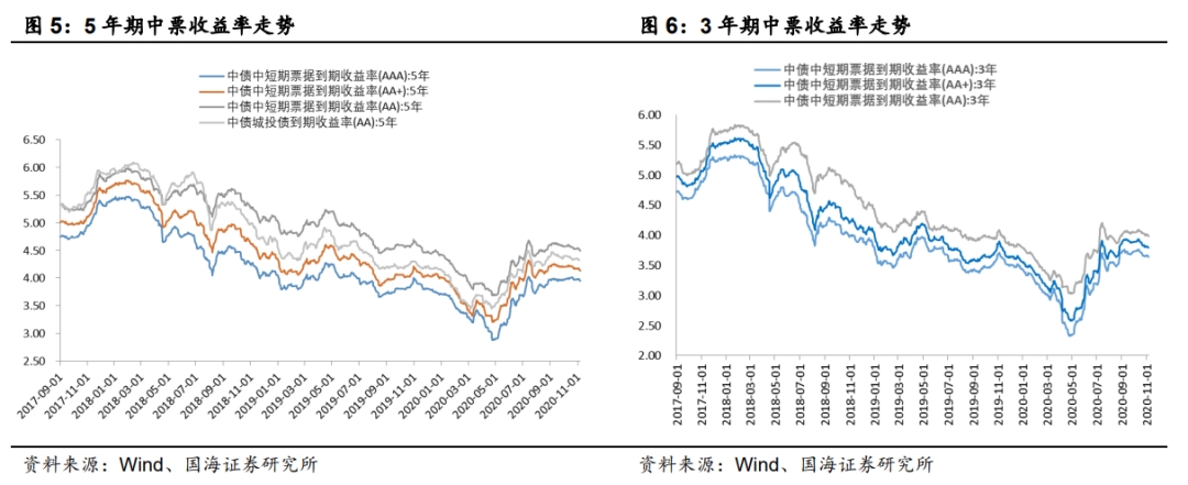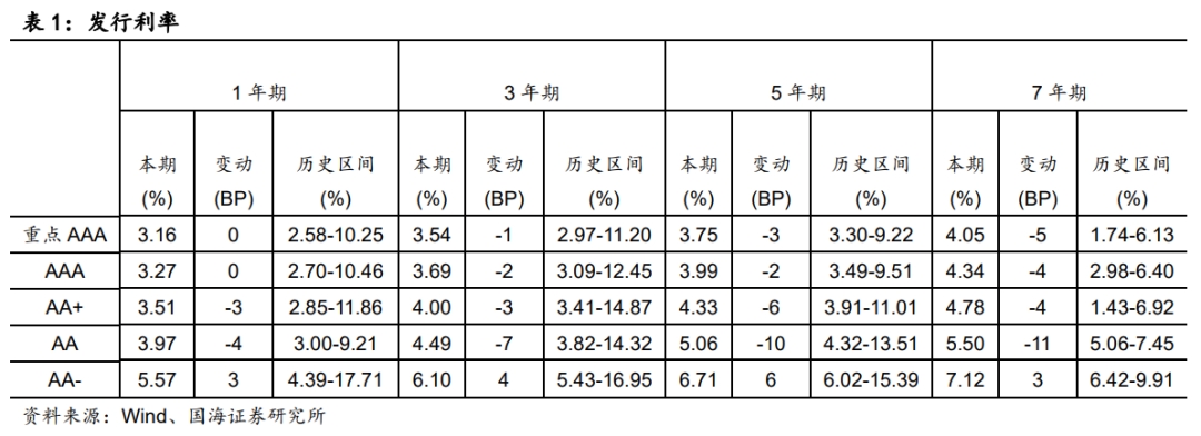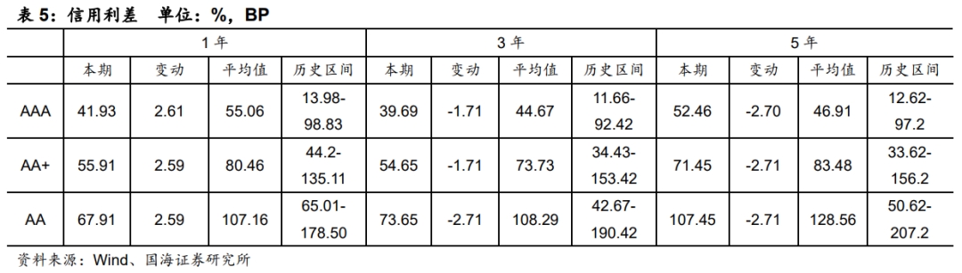 本期3年期和5年期中票收益率均有所下行。3年期AAA、AA+、AA中票收益率分别变动-2.15BP、-2.15 BP、-3.15BP至3.64%、3.79%和3.98%;5年期AAA、AA+、AA中票收益率分别变动-3.69BP、-3.70BP、-3.70BP至3.95%、4.14%和4.50%。