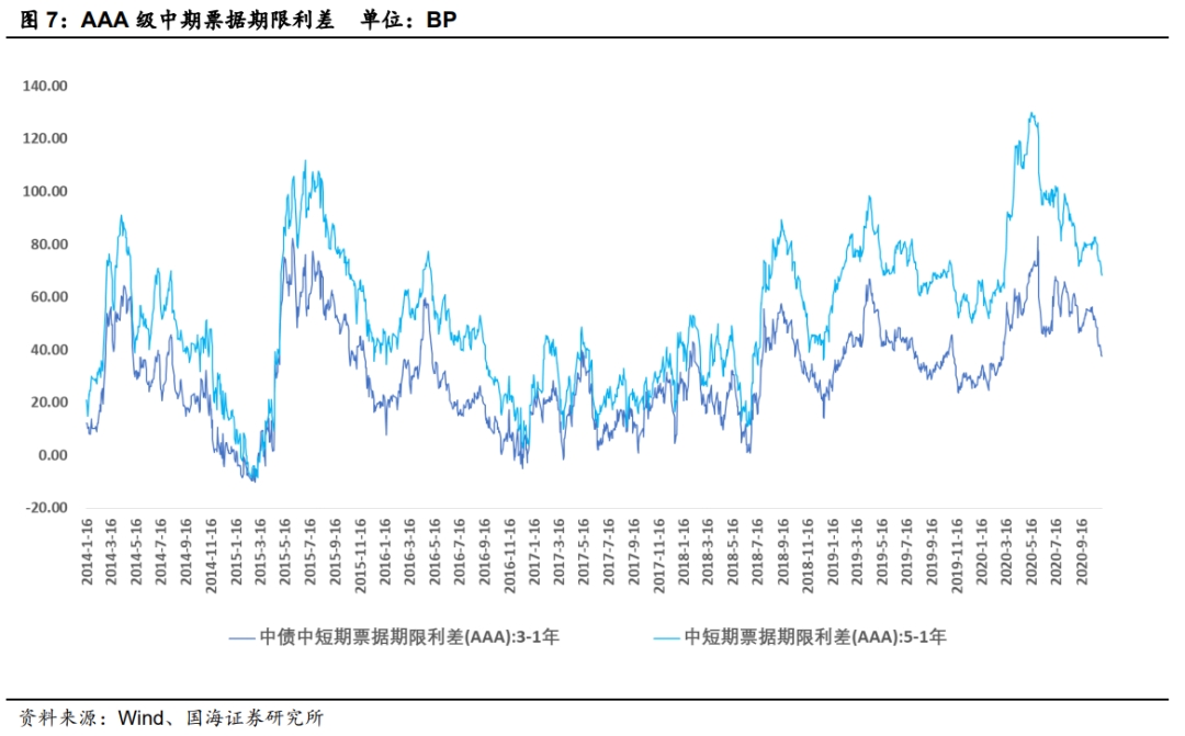 采用AAA级各期限中短期票据的差异作为利差标的。2020年11月6日,3年期与1年期、5年期与1年期利差分别为37.64BP、68.40BP,相比于上期分别变动-3.84BP、-5.38BP。3年期和5年期中票期限利差均有所收窄。