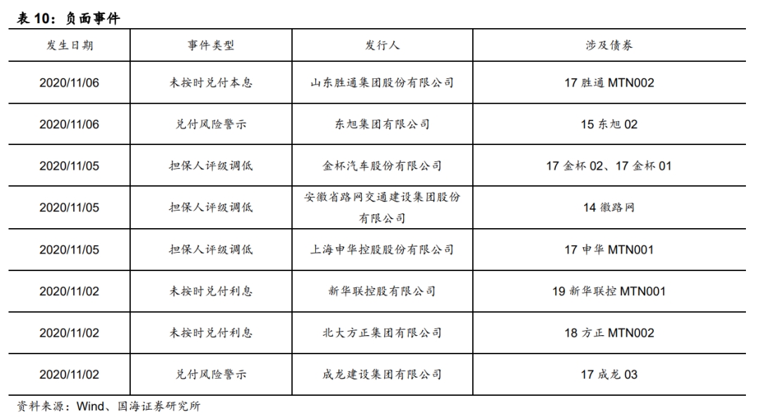 本期负面事件有(1)山东胜通集团股份有限公司未按时兑付本息、(2)东旭集团有限公司兑付风险警示、(3)金杯汽车股份有限公司担保人评级调低、(4)安徽省路网交通建设集团股份有限公司担保人评级调低、(5)上海申华控股股份有限公司担保人评级调低、(6)新华联控股有限公司未按时兑付利息、(7)北大方正集团有限公司未按时兑付利息、(8)成龙建设集团有限公司兑付风险警示。