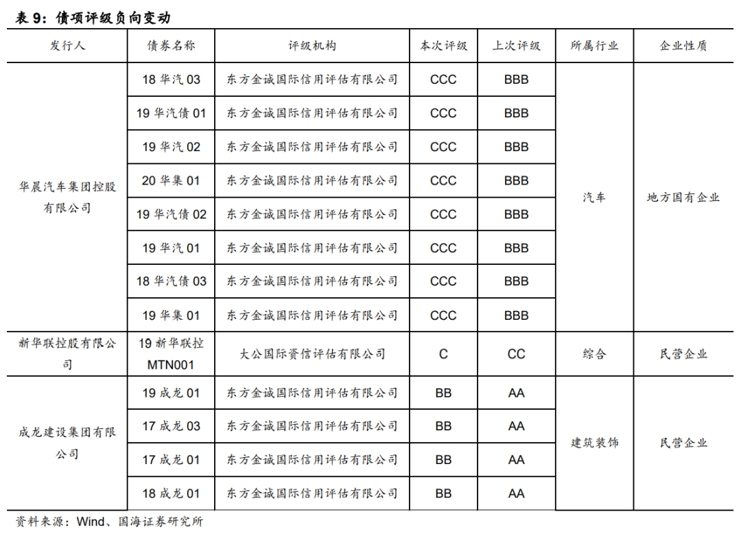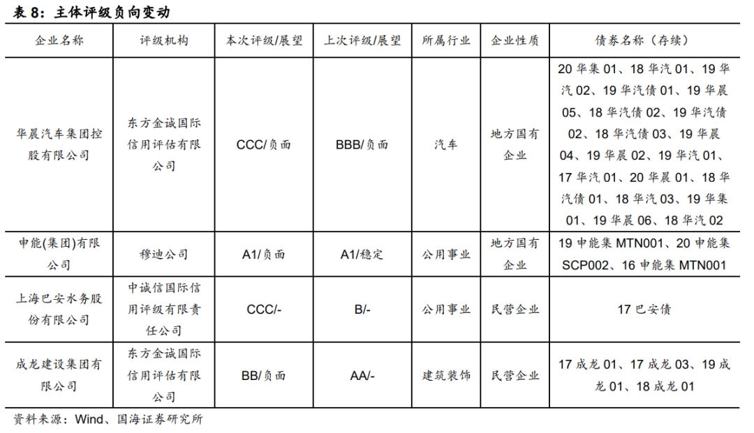 本期主体评级负向级别调整的企业共4家,涉及汽车、公用事业和建筑行业,其中2家为地方国有企业,2家为民营企业。本期债项评级负向级别调整的共3家企业的13只债券,涉及汽车、综合和建筑装饰行业,其中1家为地方国有企业,2家为民营企业。