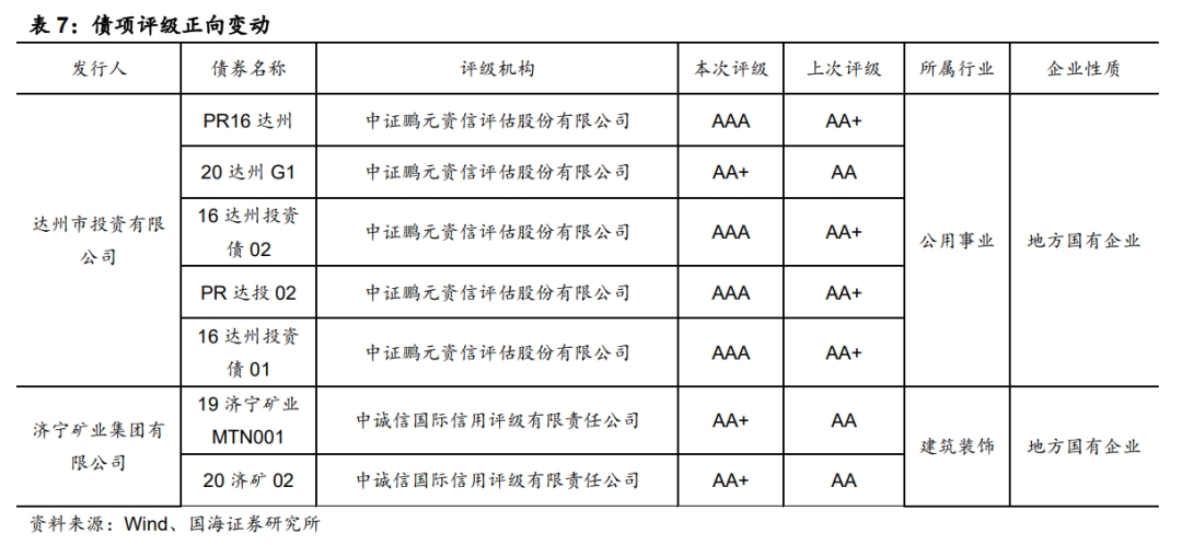本期主体评级正向级别调整的企业共3家,涉及公用事业行业和采掘行业,其中1家为民营企业,2家为地方国有企业。本期债项评级正向级别调整的共2家企业的7只债券,为主体评级正向级别调整的企业。