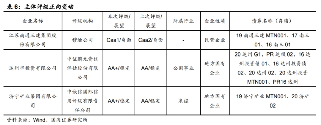 本期主体评级正向级别调整的企业共3家,涉及公用事业和采掘行业,其中1家为民营企业,2家为地方国有企业。本期债项评级正向级别调整的共2家企业的7只债券,为主体评级正向级别调整的企业。本期主体评级负向级别调整的企业共4家,涉及汽车、公用事业和建筑行业,其中2家为地方国有企业,2家为民营企业。本期债项评级负向级别调整的共3家企业的13只债券,涉及汽车、综合和建筑装饰行业,其中1家为地方国有企业,2家为民营企业。