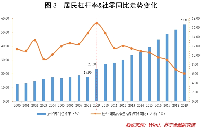 二是在于居民杠杆率。自2008年以来,我国居民部门杠杆率呈现出快速攀升趋势,短短11年就从18%升至55.8%(2019年),到了2020年第二季度更是直逼60%。这当中,个人购房贷款成为居民部门债务增长的主要力量,特别是2014年下半年以来,新增购房贷款对新增居民负债的贡献率高达60%,直接造成了消费增长动力不足,并掣肘了居民消费潜力的释放(见图3)。