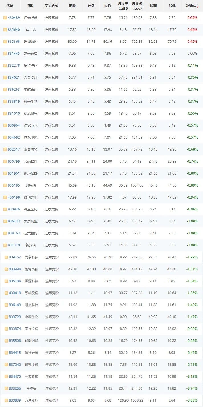 11月11日,精选层普跌,33家企业3家涨,1家平盘,29家跌;其中,佳先股份(430489)涨幅居首,上涨0.65%;其次,富士达(835640)上涨0.45%;万通液压(830839)连续两日跌幅居首,下跌3.88%;生物谷(833266)下跌3.74%居次;龙泰家居(831445)平盘。