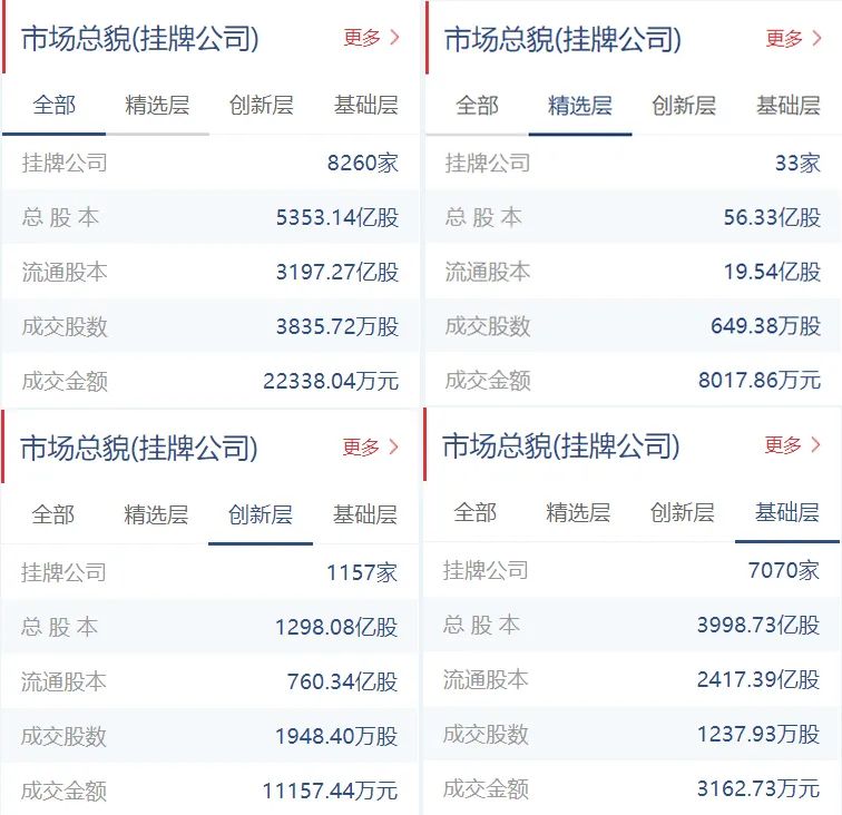 新三板挂牌公司总计8260家(精选层33家,创新层1157家,基础层7070家),总股本5353.14亿股,流通股本3197.27亿股。
