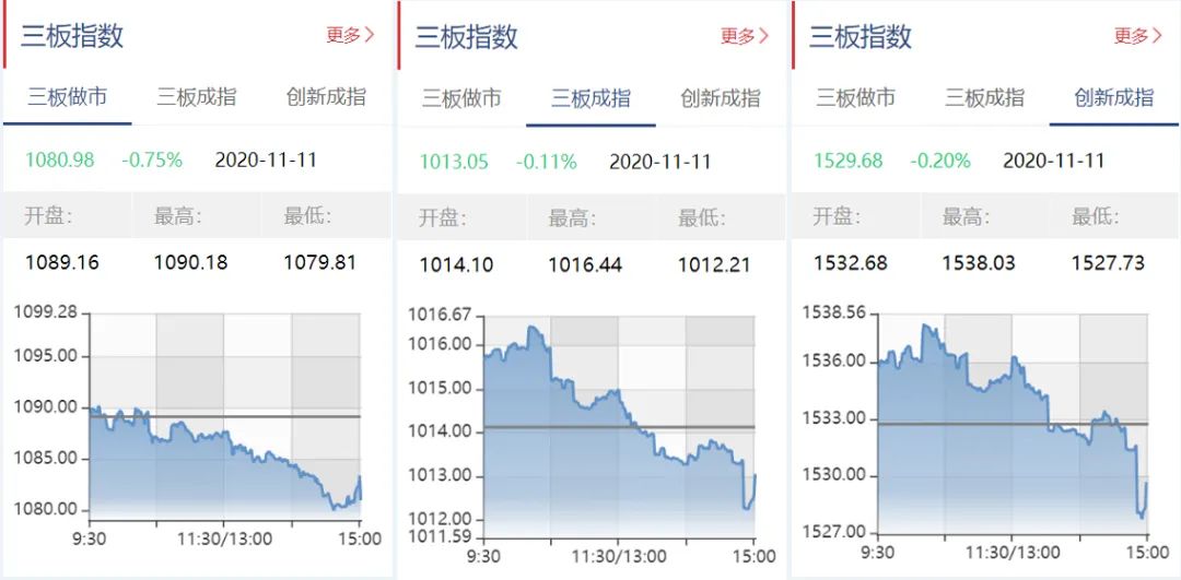 截至11月11日收盘,三板做市报1080.98点,下跌0.75%;三板成指报1013.05点,下跌0.11%;三板创新成指报1529.68点,下跌0.20%。