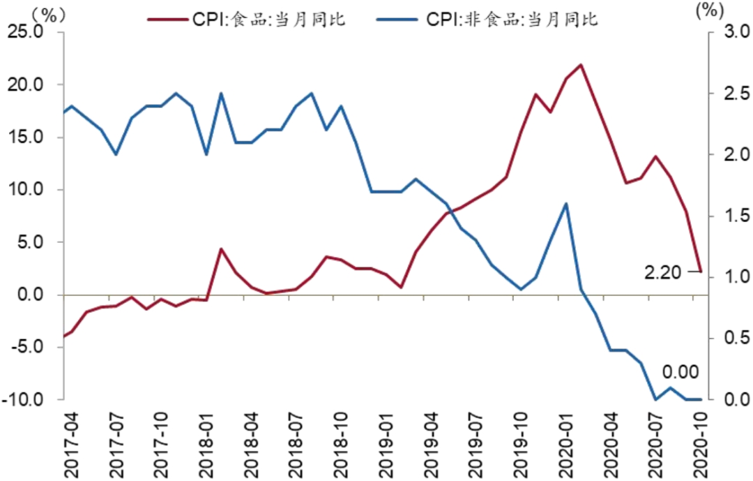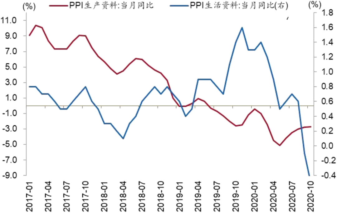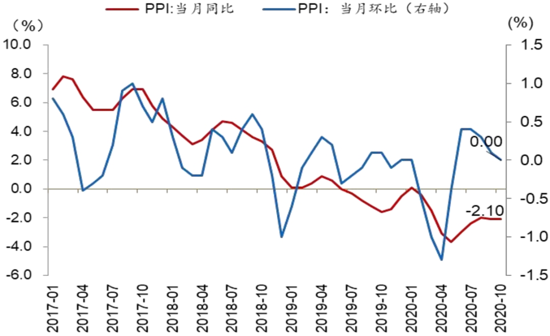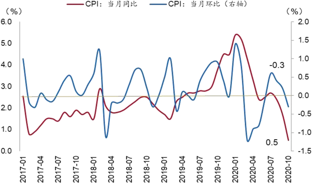 2020年10月CPI同比0.5%(市场预期0.7%),前值1.7%。PPI同比-2.1%(市场预期-2.1%),前值-2.1%。对此我们点评如下: