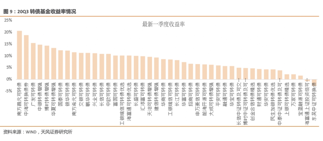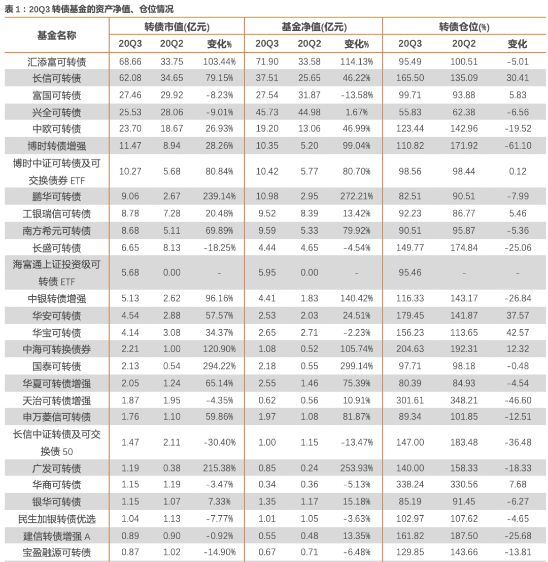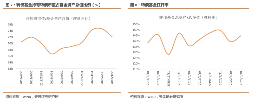 20Q3可转债市值占基金资产总值的比例由20Q2的74.61%下滑至72.15%,或由于在9月转债市场显著回调的情况下,一方面基金对于转债仓位有所控制,另一方面前期转债基金收益提升的背景下基金资产总值有所提升。20Q3转债基金杠杆水平较20Q2小幅上升5.25pct至144.74%。