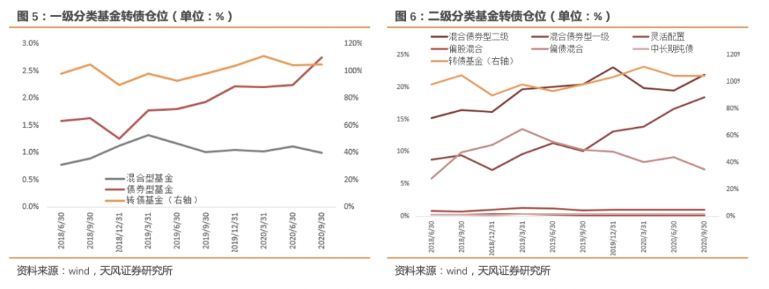 从转债仓位(持有转债市值/资产净值)来看,20Q3一级分类的债基仓位提升0.50pct至2.74%,转债基金和混基仓位与20Q2基本持平,转债基金仓位微升0.37pct至104.43%,,混基仓位小幅回落0.12pct至0.99%。