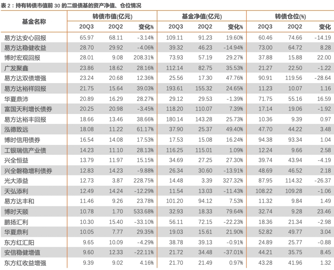此外,剔除了转债基金后,从持有转债市值前三十的二级债基的持仓来看,所持转债市值由20Q2的415.60亿元上升至483.88亿元,环比提升16.43%,参与转债市场的活跃度提升。在三季度国债利率整体抬升的背景下,加配转债从而获取权益市场收益是提升组合收益率的重要手段。持仓转债前三十的二级债基总净值由1712.05亿元上升至1875.49亿元,环比提升9.55%,持有转债资产最多的仍是易方达安心回报。