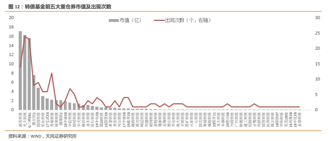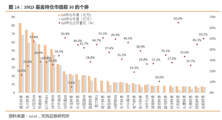 1)金融券依旧是重仓首选,且持仓规模均有所提升。浦发、光大和苏银转债依旧是基金前五大重仓券,且20Q3整体持仓规模较20Q2均有所提升,主要是由于临近年底,机构往往为了锁定收益,选择换仓至安全边际高的品种,而银行板块市值大、流通性好,便于部分机构作为底仓。低估值、高 YTM 的偏债性品种浦发转债(83.04亿)依旧是最核心的基金配置品种,持仓规模较20Q2提升20.6%。偏股性品种光大(74.97亿)较 20Q2增持25.8%。苏银(49.53亿)较20Q2增持34.8%至57.74亿。券商长证、国君转债持仓规模分别较20Q2增持了41.8%和37.8%。