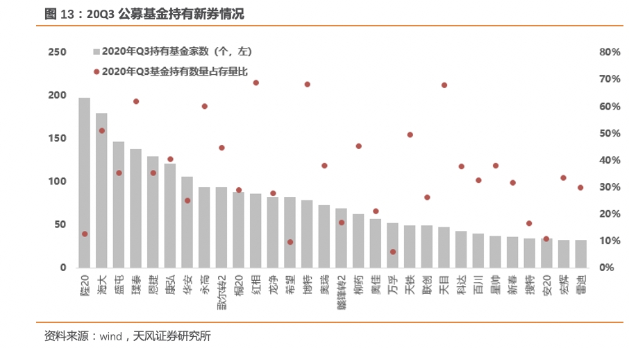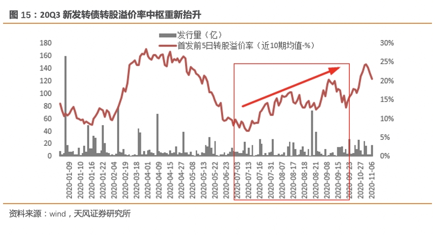 3)在信用边际收紧背景下,基金风险偏好有所提升:20Q3公募基金转债持仓占市场流通额接近30%,持仓市值环比增长21%,显著超过市场流通额增速(9.5%)。估值方面,剔除可交债与银行后转债9月30日加权溢价率均值为22.31%高位,与7月3日的22.67%接近,市场估值仍处于较高位置。但市场对于新上市行业龙头标的转债的热捧显著提升,从下图可以看到,Q3新上市转债转股溢价率中枢逐步抬升,这在一定程度上反映基金对于转债热度的提升,也有可能是基于前期高位标的在8-9月市场调整过程中向新标的的调仓。